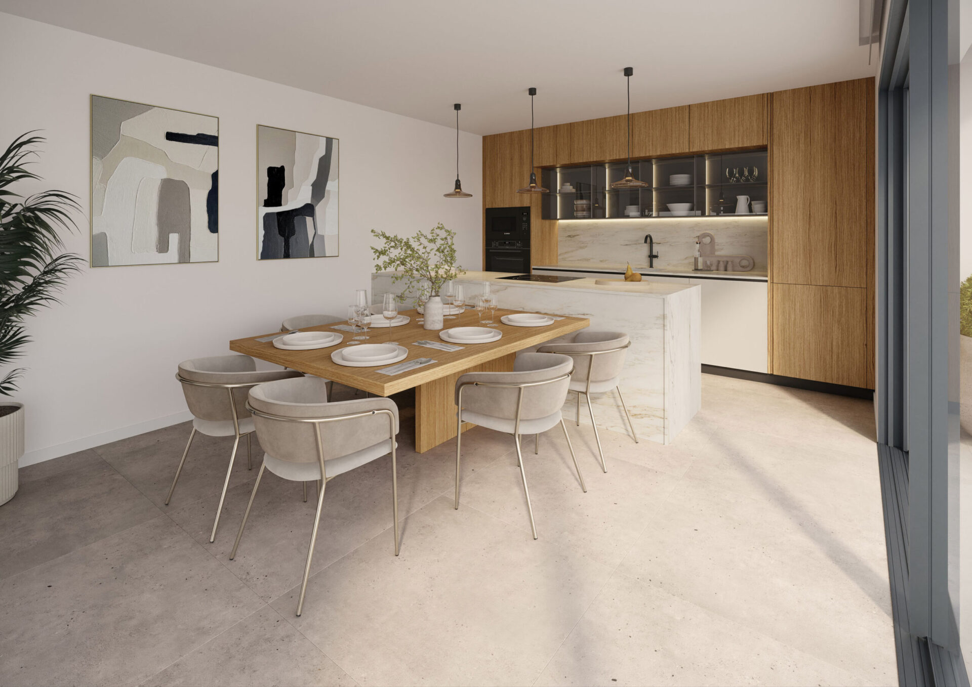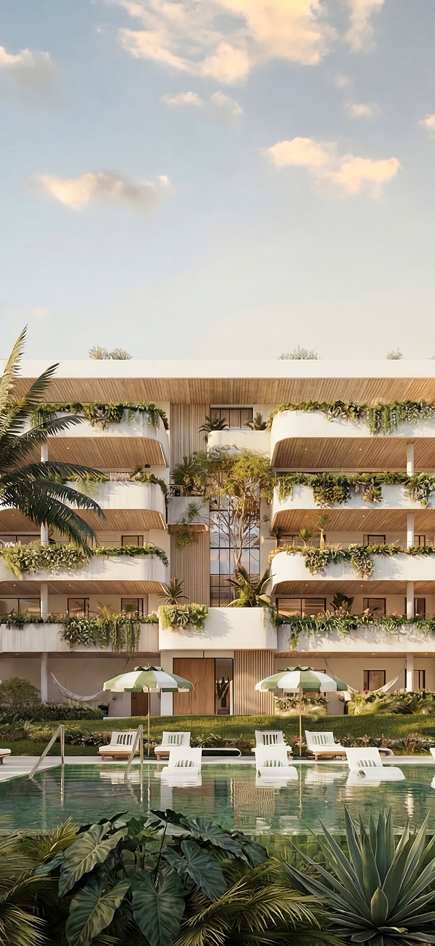 Single-level homes located on the front-facing corners of the development, conceived to maximise light and a sense of openness. Layouts allow expansive terraces and outdoor areas, and every home features a private pool integrated into the exterior space to enjoy the Mediterranean climate in complete comfort. The outdoor kitchen can be added as a customisation in selected units.