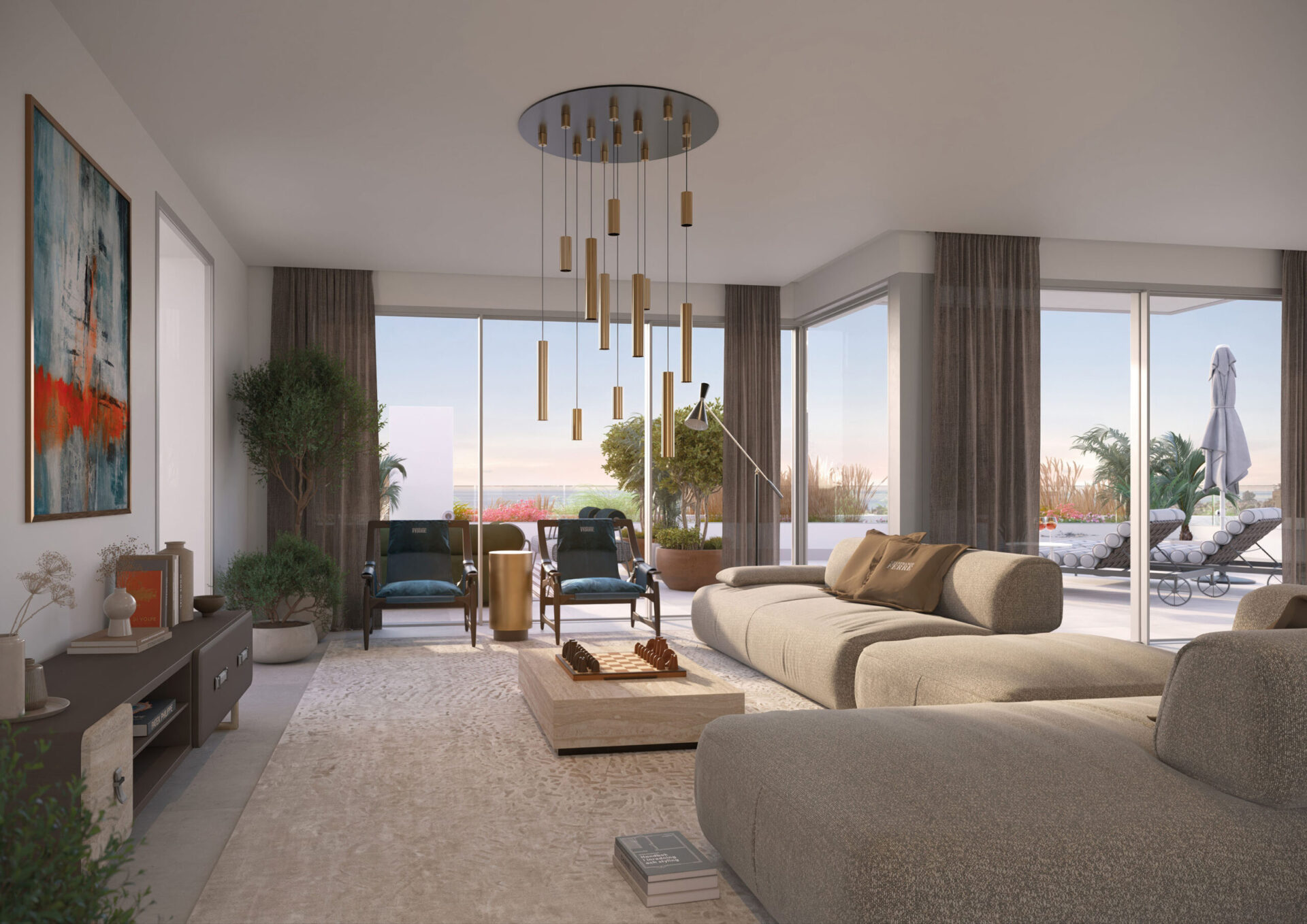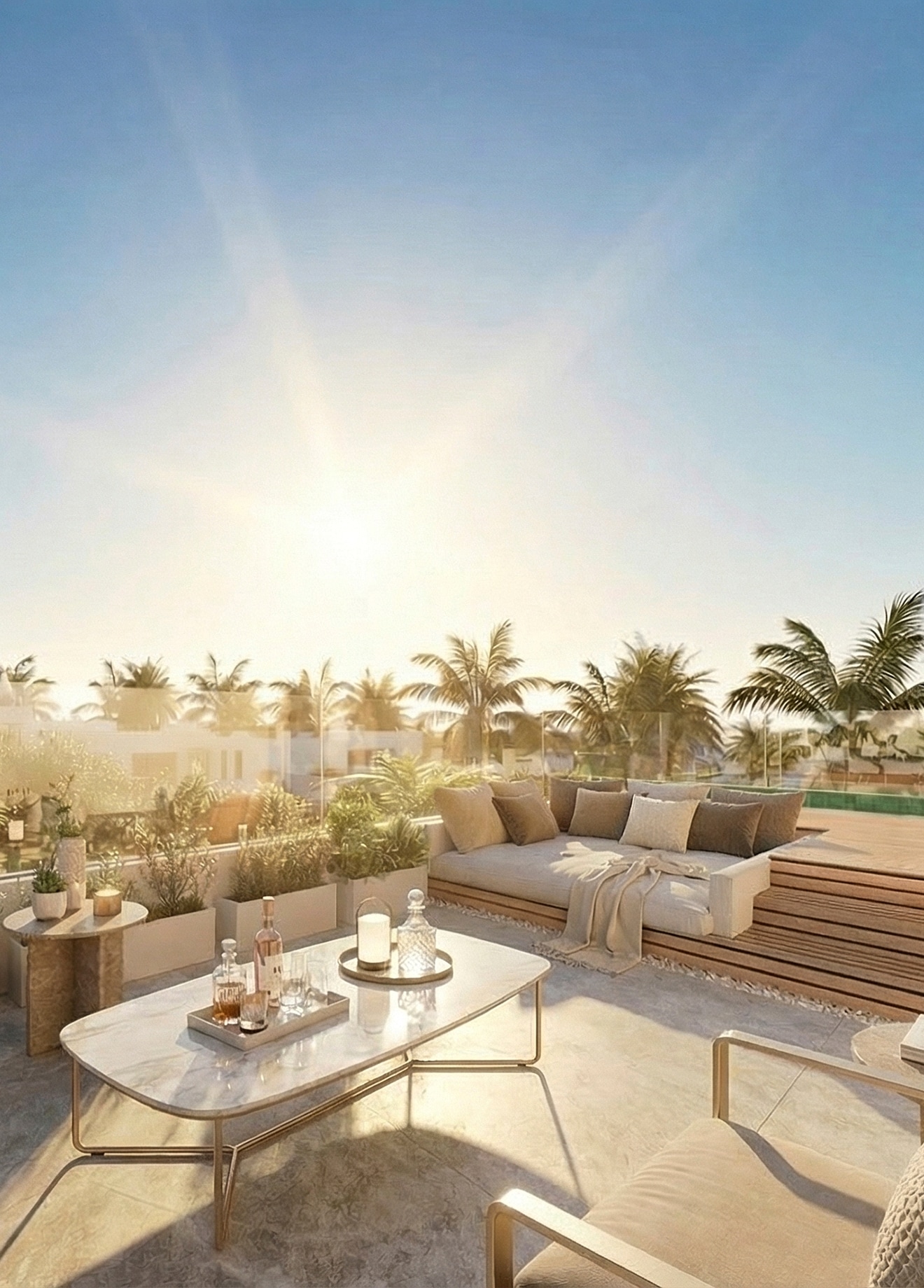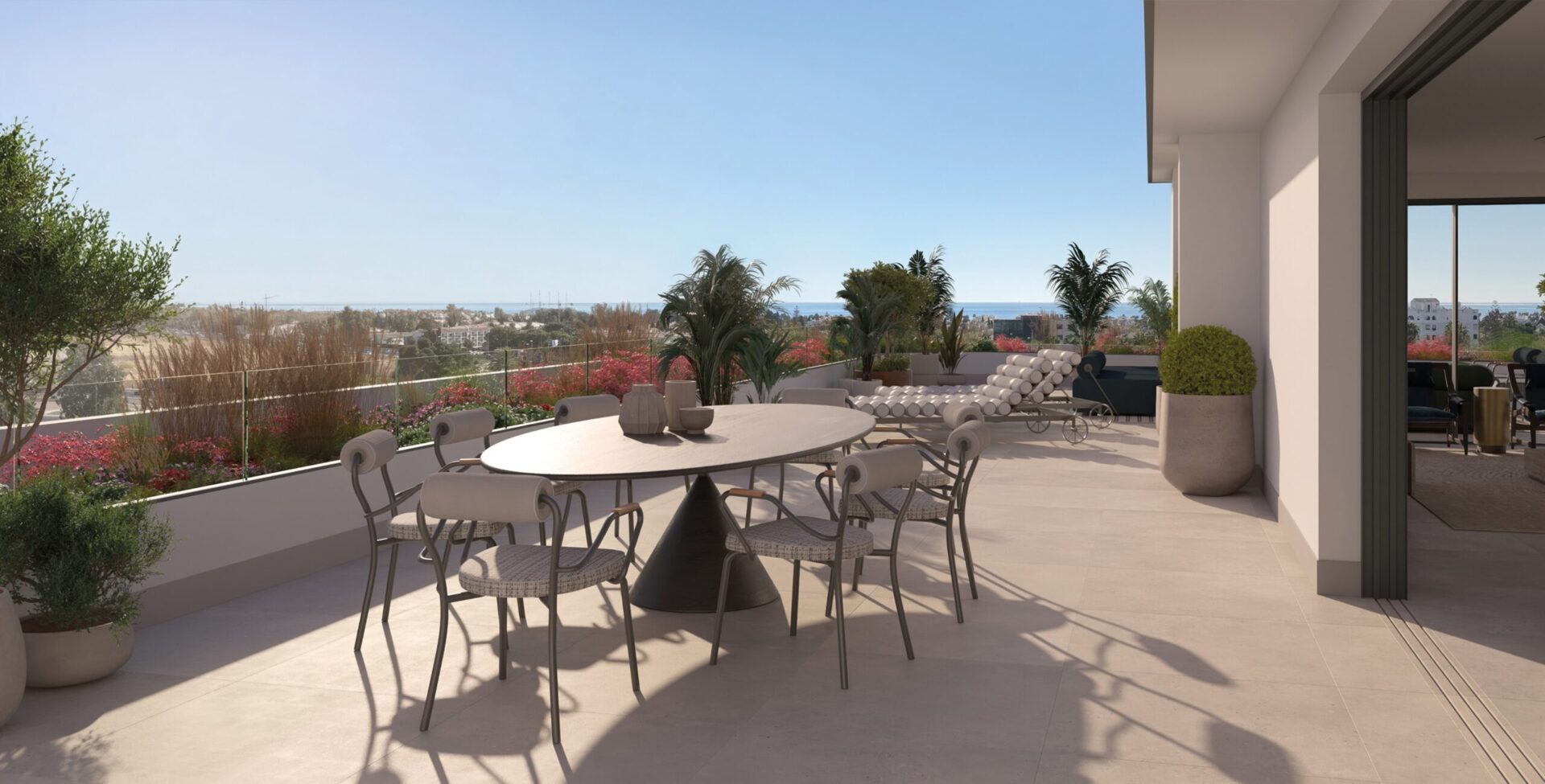 Duplex penthouses with expansive terraces, solarium and a private pool. With open views of the Mediterranean and La Concha, outdoor spaces are designed as true rooftop living areas: lounge zones and al fresco dining, with the outdoor kitchen available as a customisation in all Sky Villas to enjoy Mediterranean living to the fullest.
